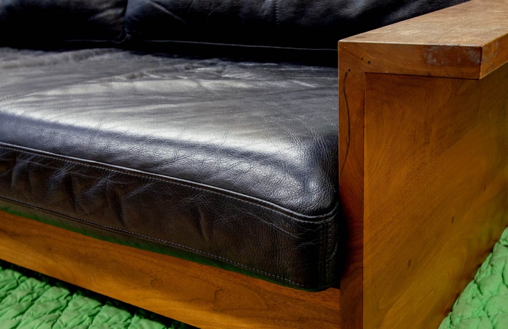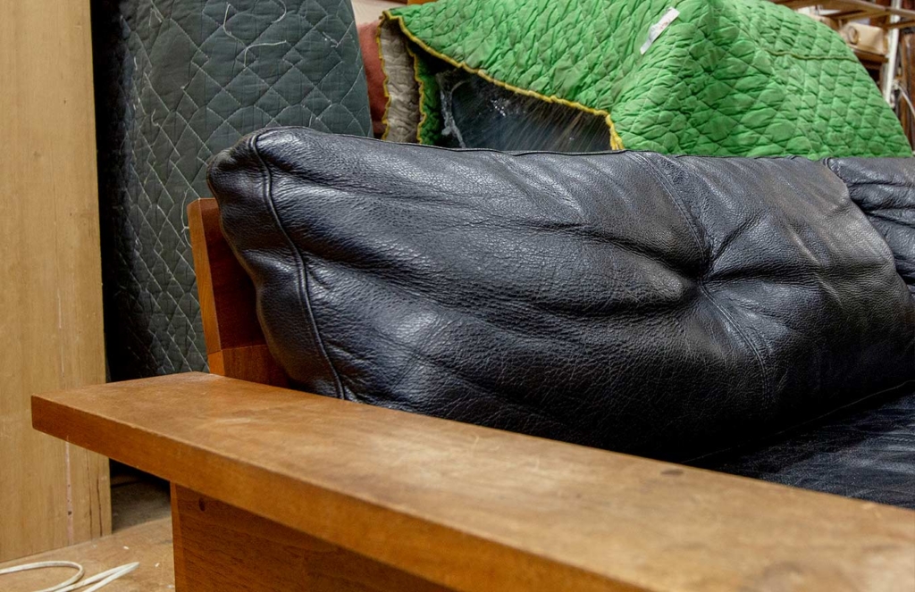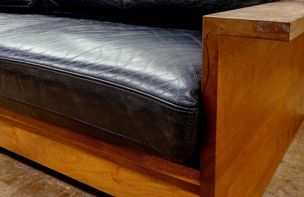 転居のタイミングで購入された、木フレームの本革ソファ。新居のインテリアとコーディネイトして選ばれた、お気に入りの品です。少し付いた輪染みや、経年変化で淡い色味になった木肘から、永年お使いになっている様子が窺えます。