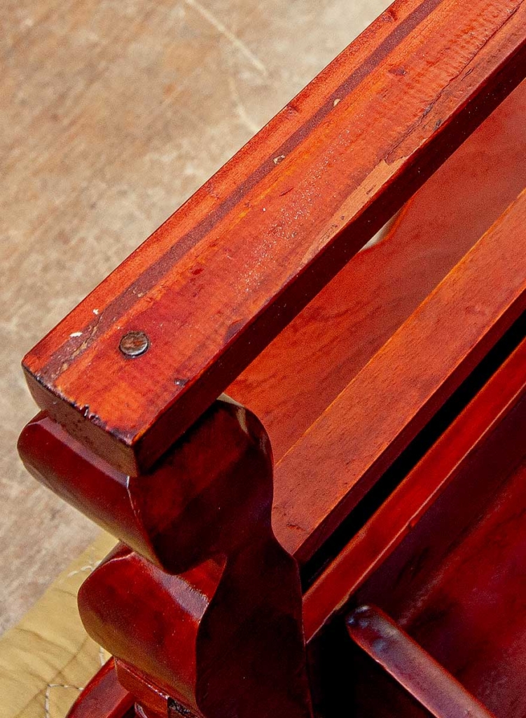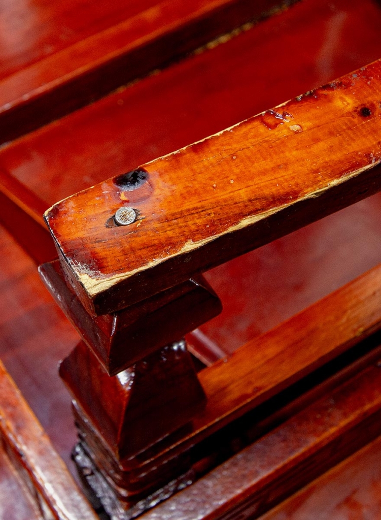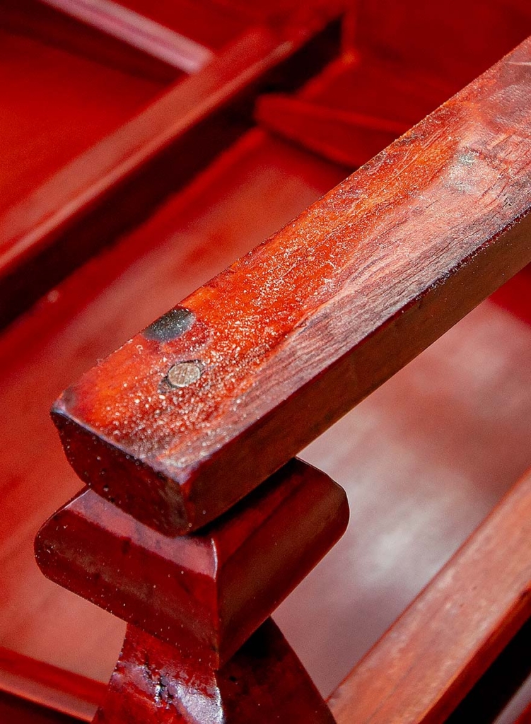 永年ご家族と共に過ごしてきた、想い出の円卓。ご愛用の品だからこそ、徐々に塗装の艶も消え、天板や脚も傷みが大きくなってきました。床に接するスキー脚の木部が欠け、ガタツキも気になるように。