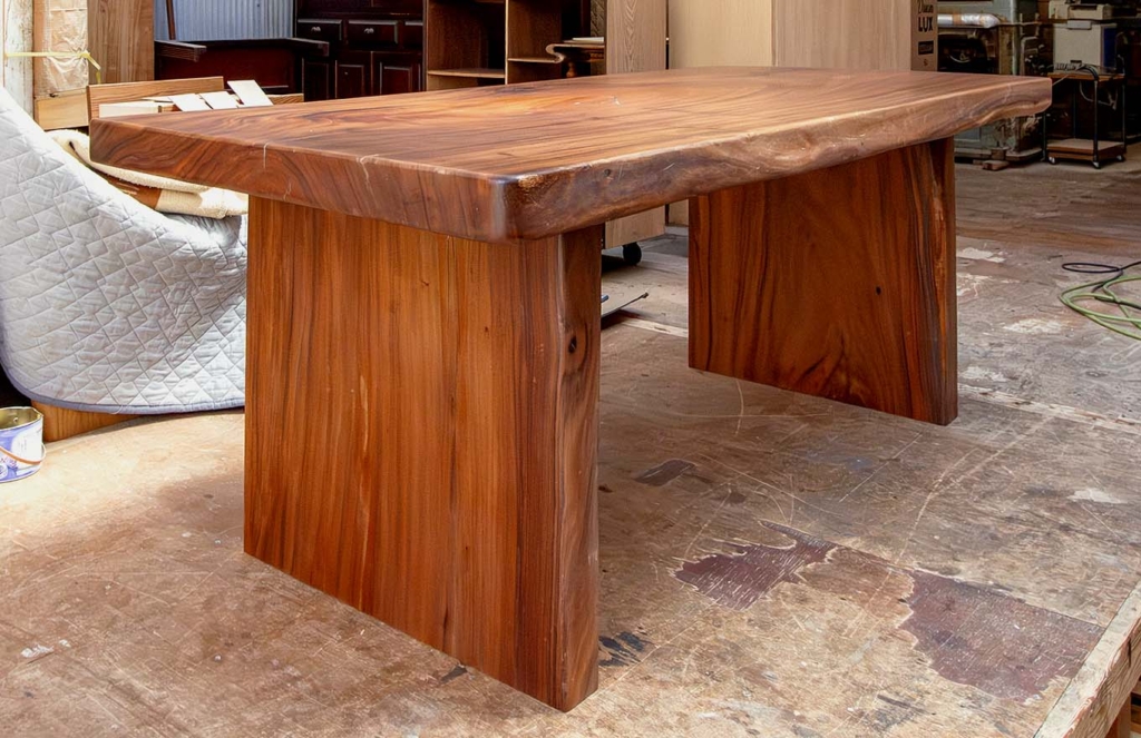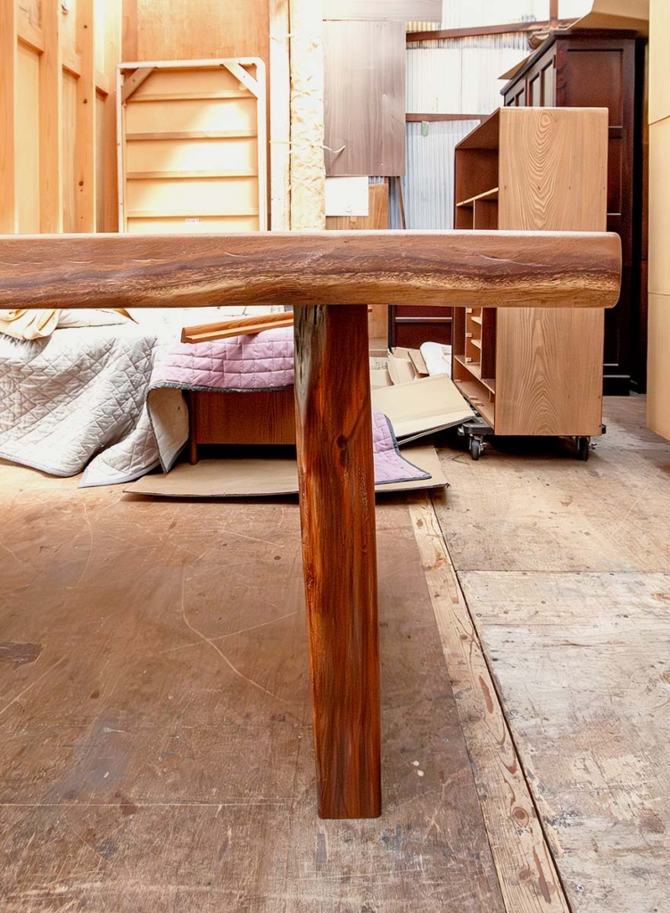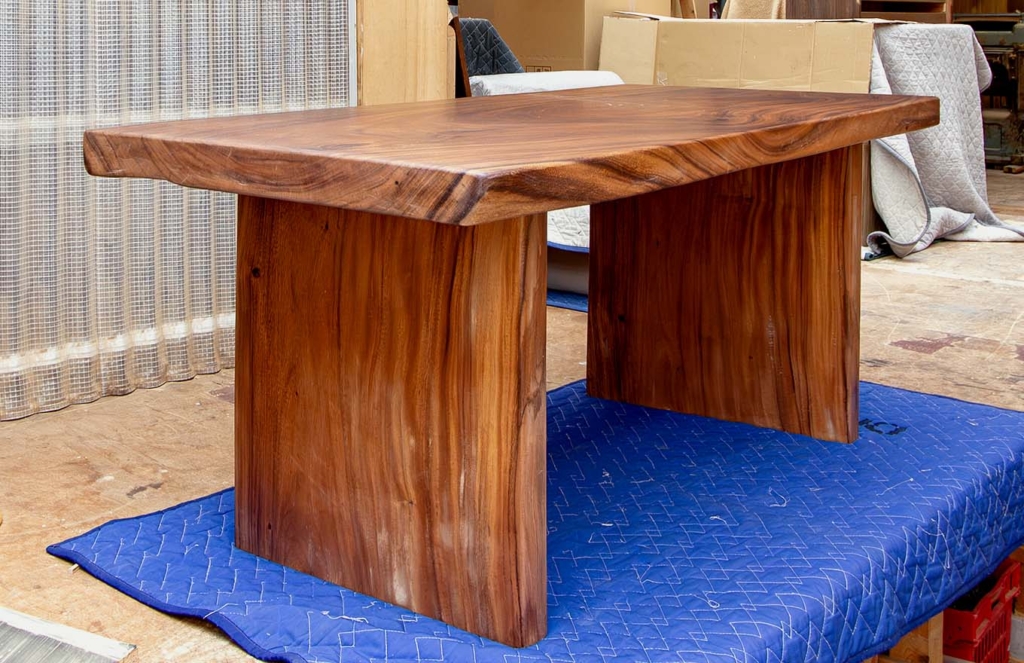 重厚感のある、一枚板のダイニングテーブル。マレーシアに在住していたお客さまが、日本へ本帰国する際、最後の想い出に購入されたお品です。