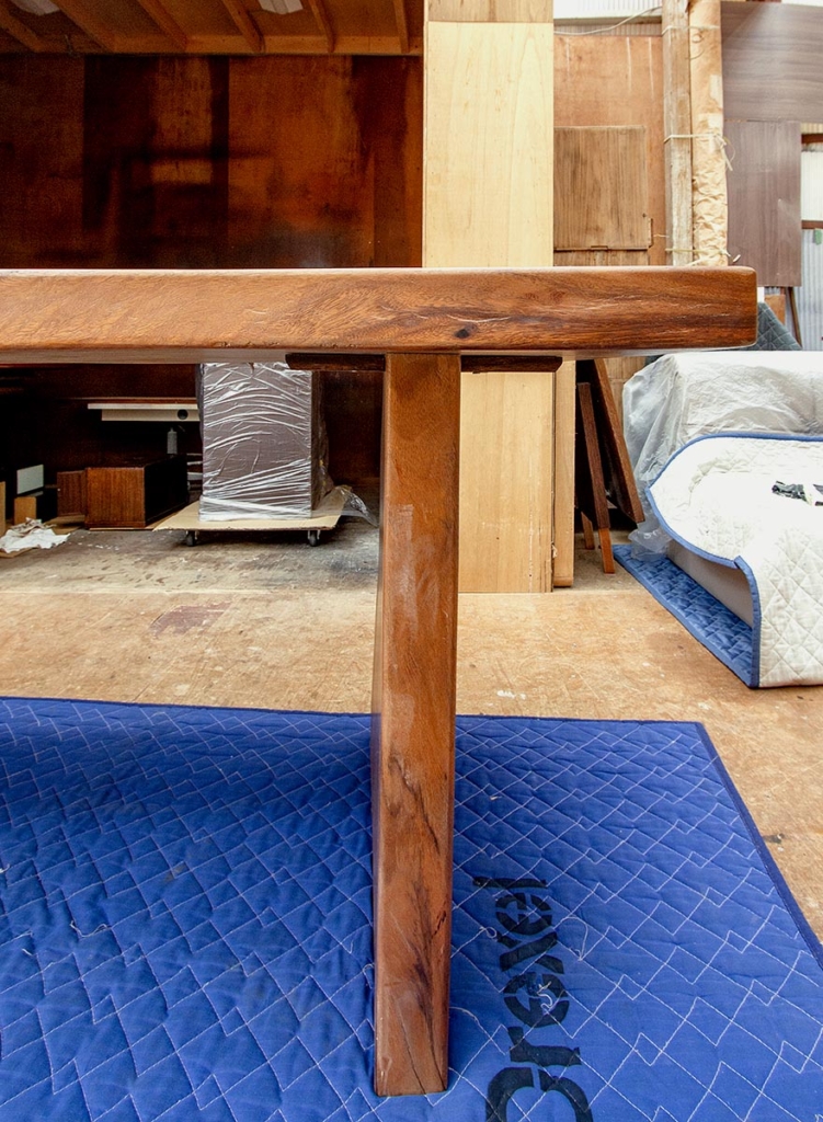 脚の傾きや白田の調整等、全体的に手入れをしたダイニングテーブル。脚もカットし、新たに揃えた椅子に合う高さに調整しました。細やかな修理で、より使いやすくなりました。