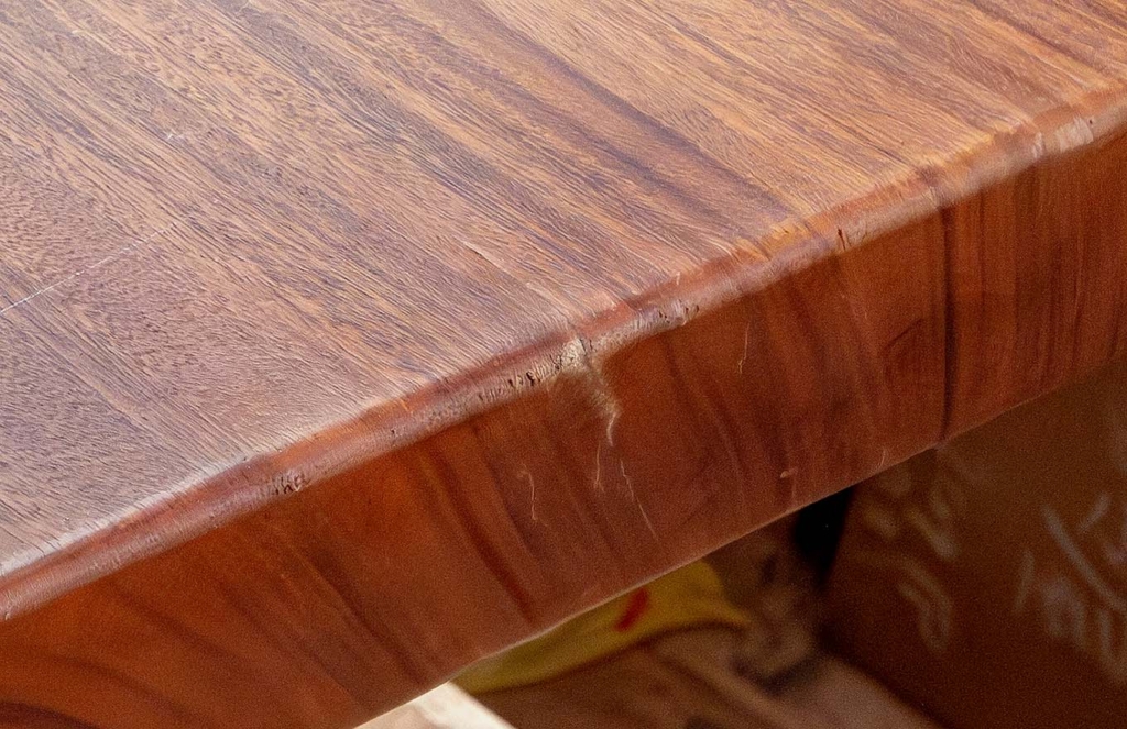 お気に入りの家具店で見つけた際、展示品が売約済みだったそうで、急ぎ同じ品を製作し、日本へ船便で送っていただく事に。新たに作ったテーブルが日本へ到着し、ご家族で開封されたお客さま。早速組み立ててダイニングに設置した所、テーブルの脚の歪みや、運送中に付いた傷も複数見つかりました。